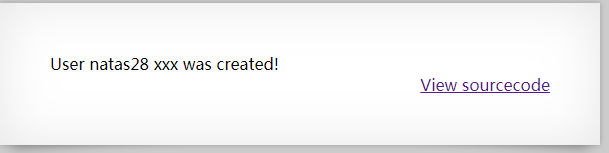 所以,正确的插入为“natas28+超过64字节的连续空格+xxx”(注意,后面的xxx是必须的,因为在mysql中’natas28’=’natas28+空格’),密码随意,可以为空。