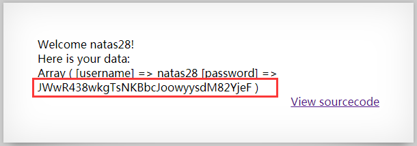 比较username时mysql并不会对提交的username进行truncate,所以判断用户名不存在,开始新建用户名和密码。一旦开始存储,就会发生溢出/截取,导致出现两个username同为‘natas28’的行。接着返回登录界面,输入natas28+密码。找寻操作会返回刚刚插入的数组(>0),所以查询成功,回显用户名和密码,这时回显的就是第一个nata28那行,即我们要获得的flag。