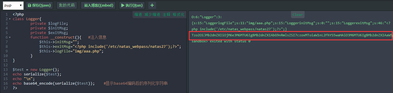 echo base64_encode(serialize($test)); #显示base64编码后的序列化字符串
