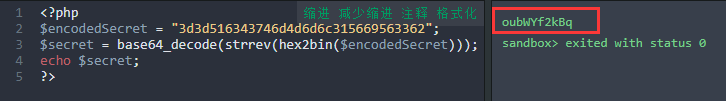 <?php $encodedSecret = "3d3d516343746d4d6d6c315669563362"; $secret = base64_decode(strrev(hex2bin($encodedSecret))); echo $secret; ?>