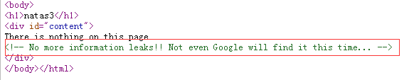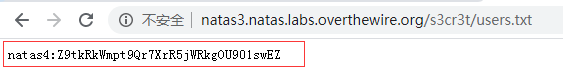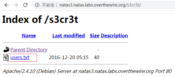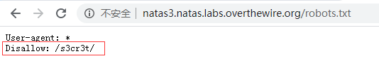 在源码中发现提示:无信息泄露,谷歌这次不会发现它。提到了搜索引擎,猜测爬虫协议robots.txt中存在信息泄露,访问网站爬虫协议http://natas3.natas.labs.overthewire.org/robots.txt,发现Disallow: /s3cr3t/,尝试访问一下该目录http://natas3.natas.labs.overthewire.org/s3cr3t/,发现了user.txt,读取得到flag。