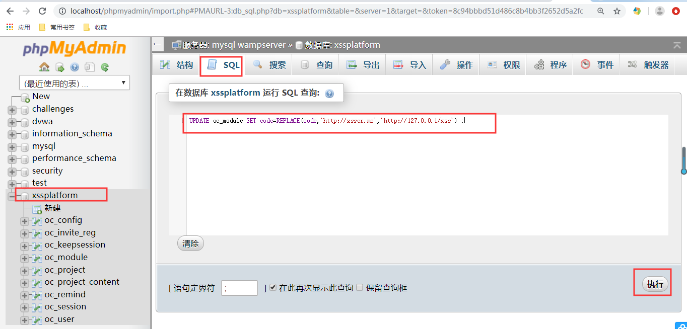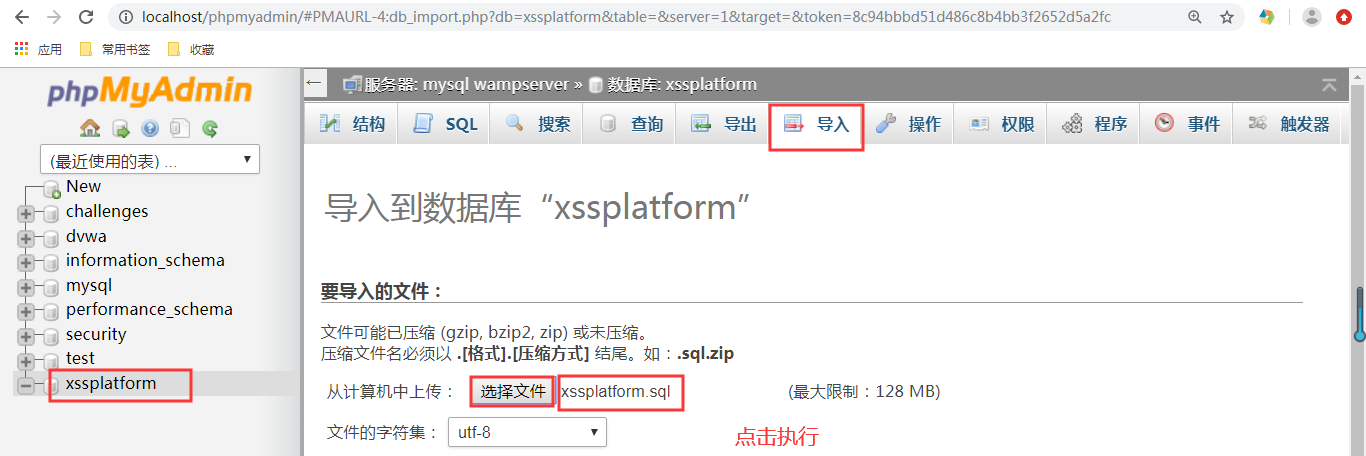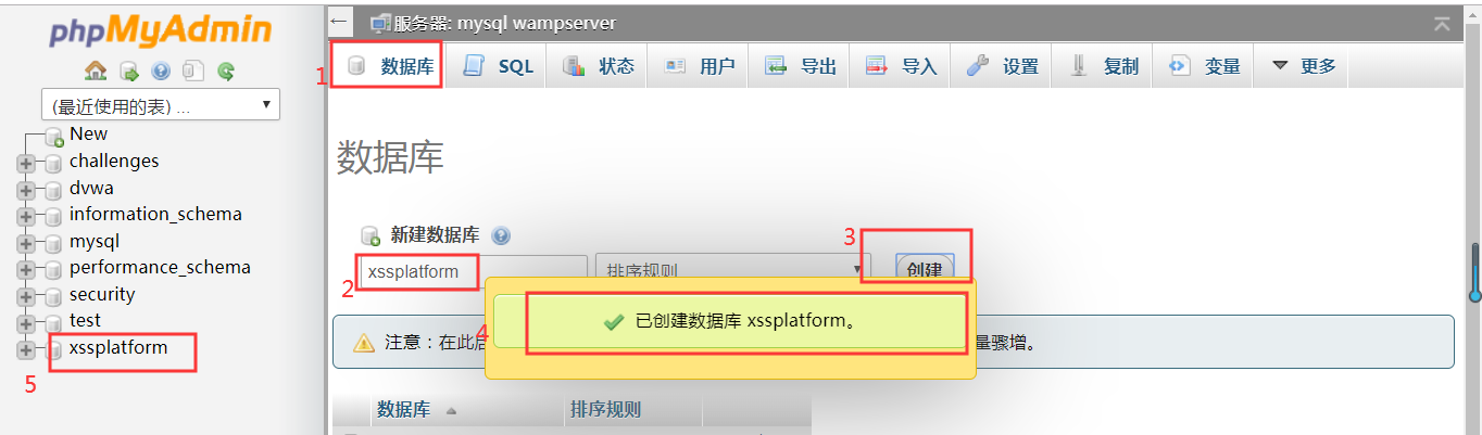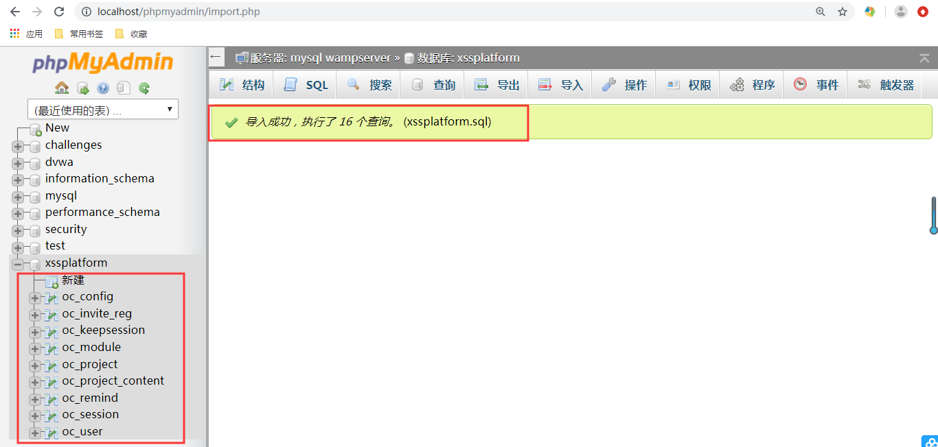 3.启动wamp服务,打开http://localhost/phpmyadmin/,在数据库中新建一个xssplatform数据库,并将源码中的xssplatform.sql文件导入到数据库中。