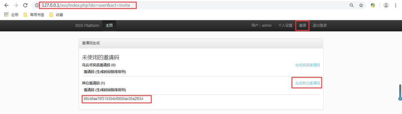13.admin用户登录,点击邀请,进入邀请码生成界面,点击“生成其他邀请码”,生成邀请码,使用此邀请码注册新用户方能成功。