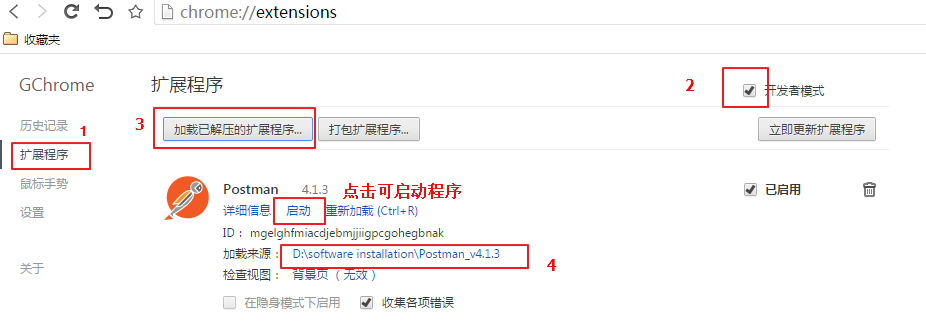 1.postman下载,解压,打开Chrome浏览器–>设置–>扩展程序–>勾选开发者模式–>加载已解压的扩展程序–>输入postman解压路径–>确定