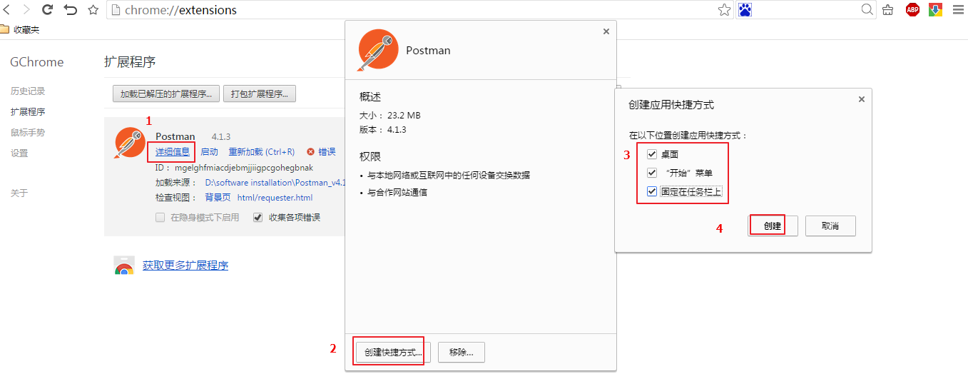 可以进入“详细信息”,为postman创建桌面快捷方式,方便下次启动。