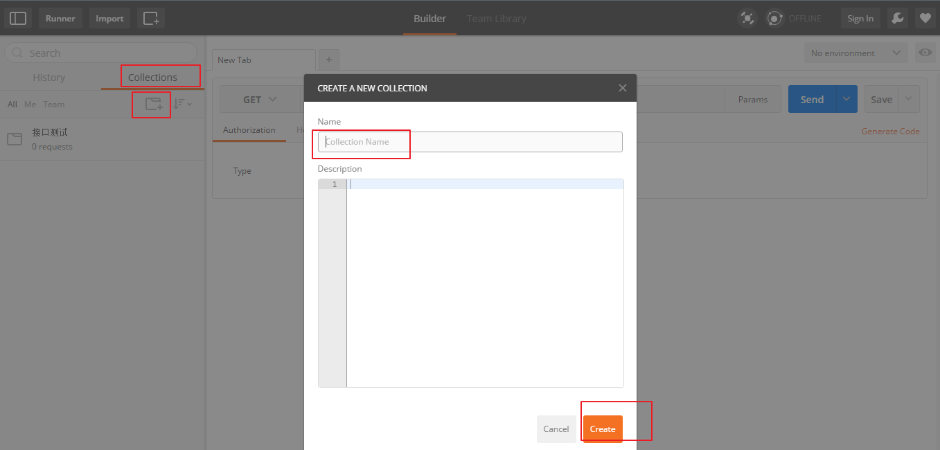 3.点击Collections–>点击“+”图标–>输入name–>确定(这样可以创建一个文件夹,比如说对某一模块进行接口测试,这个文件夹下都是这个模块的接口)
