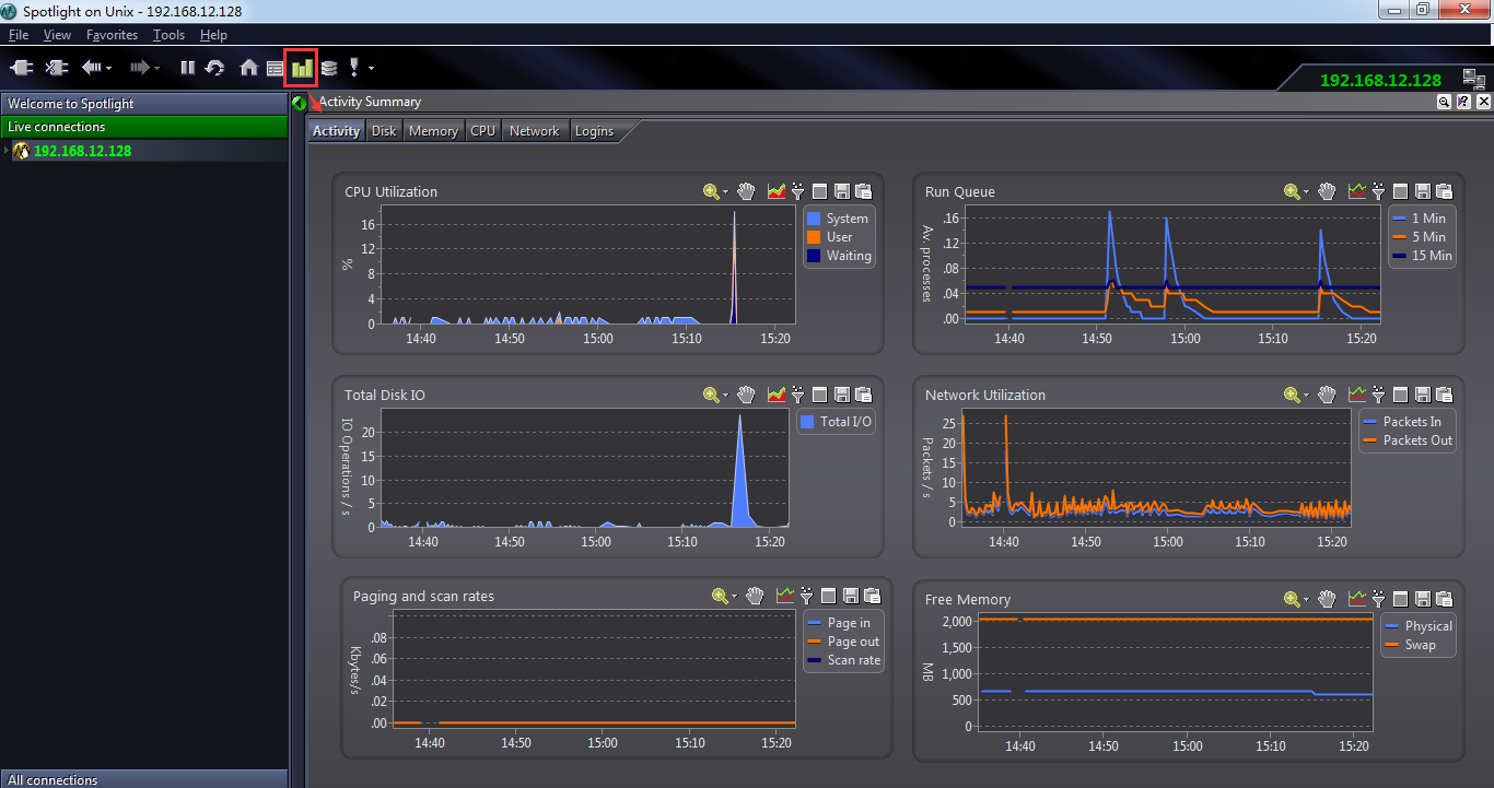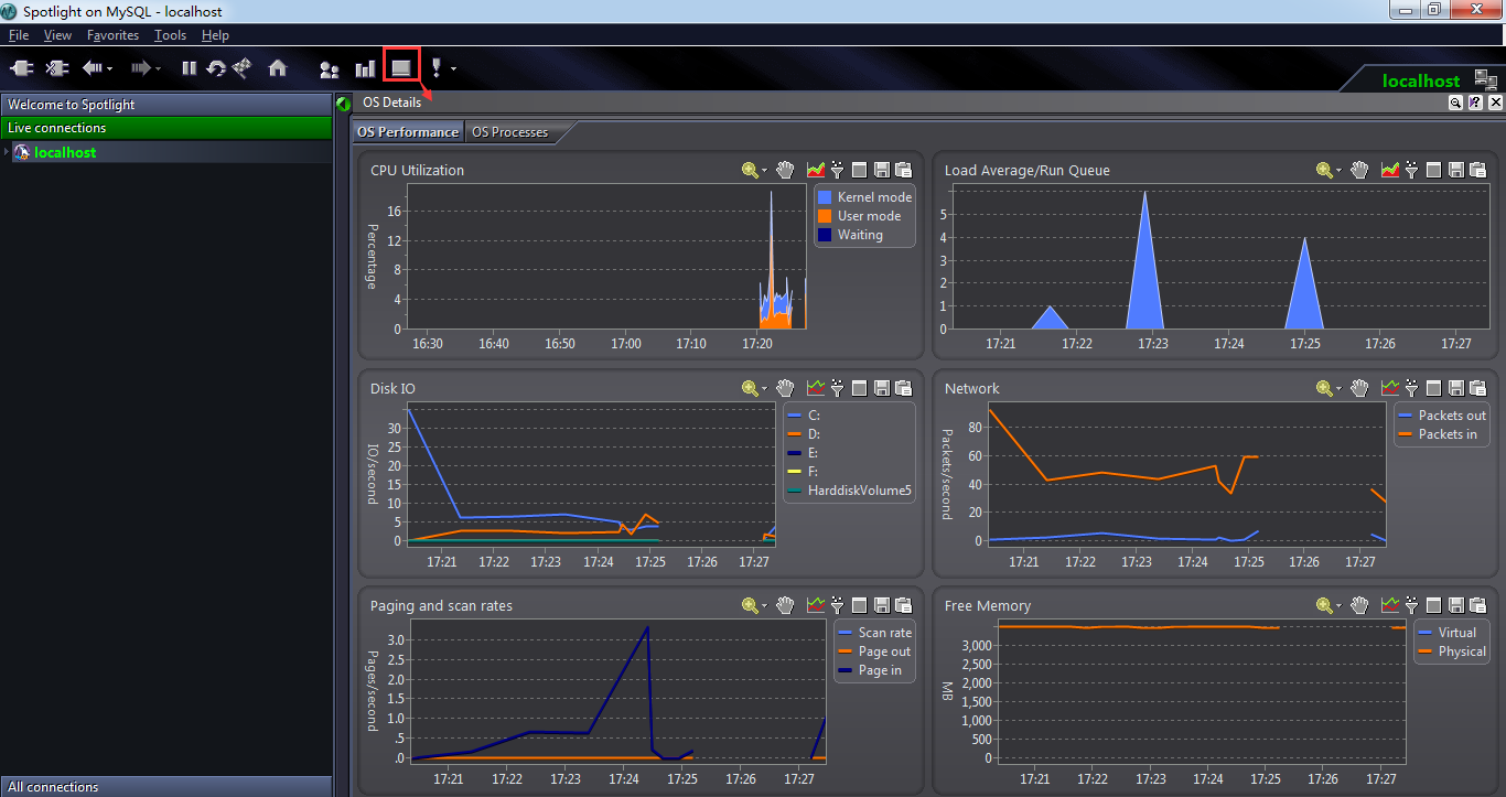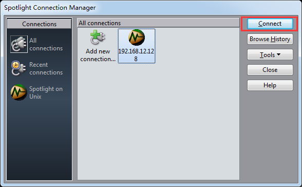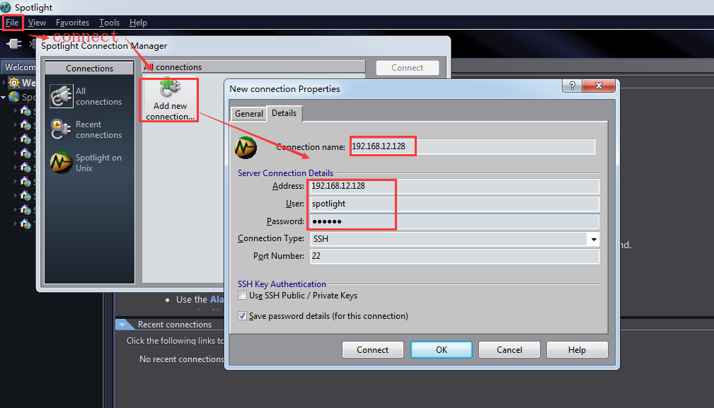 4.安装完成后,打开spotlight软件,点击File–>connect,新建一个连接,输入连接名,待监控的服务器的IP、用户名、密码、端口号等,点击OK。