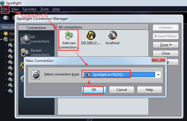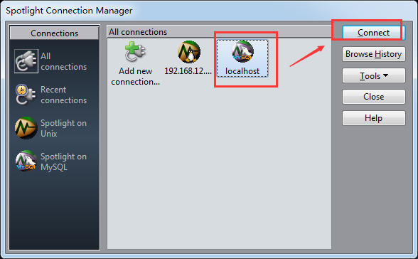 2.安装完成后,打开spotlight软件,点击File–>connect,新建一个连接,选择Spotlight on Mysql(由于我先安装了Spotlight on Unix,所以现在spotlight为2个软件的合成),点击ok。