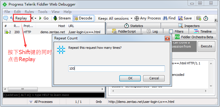 在Web Session列表中,选中一个或者多个Session,然后按下Shift键的同时单击Replay按钮,会弹出提示框,要求指定每个请求被重新发送的次数。Fiddler会用多线程同时发送该请求,相当于模拟了很多用同时访问该请求。