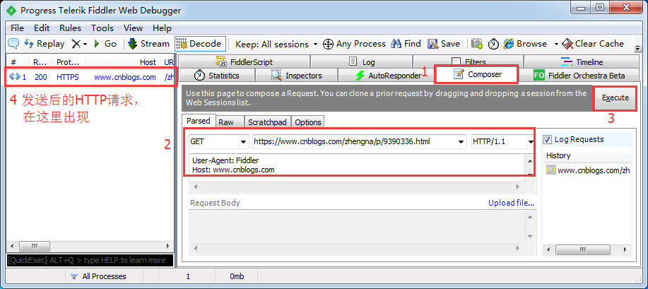 选中一个Session,单击Replay按钮,可以重新向Web服务器发送该请求。