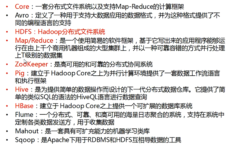 注意:红色部分是属于hadoop家族的,黑色部分是不属于hadoop家族的。