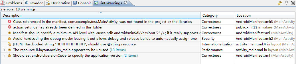 在Eclipse中右键工程,在出现的菜单中选择Android Tools中的Run Lint,即可执行Lint测试。结果如图所示。