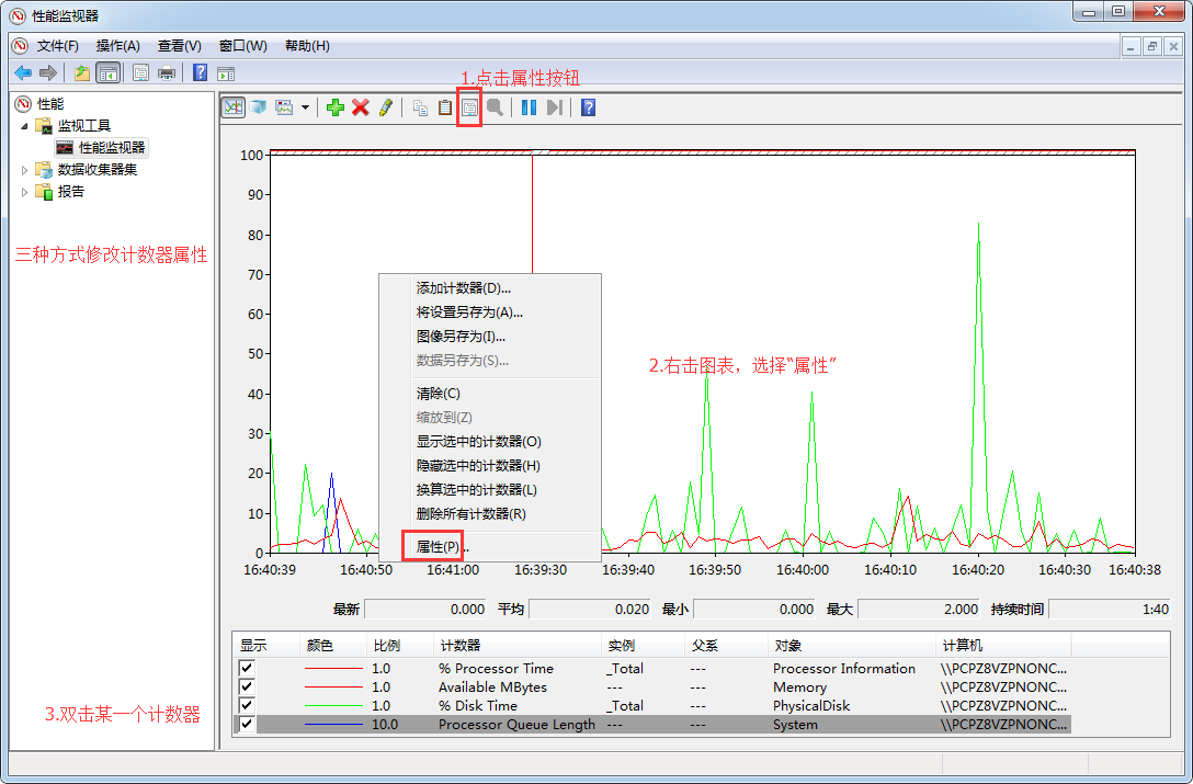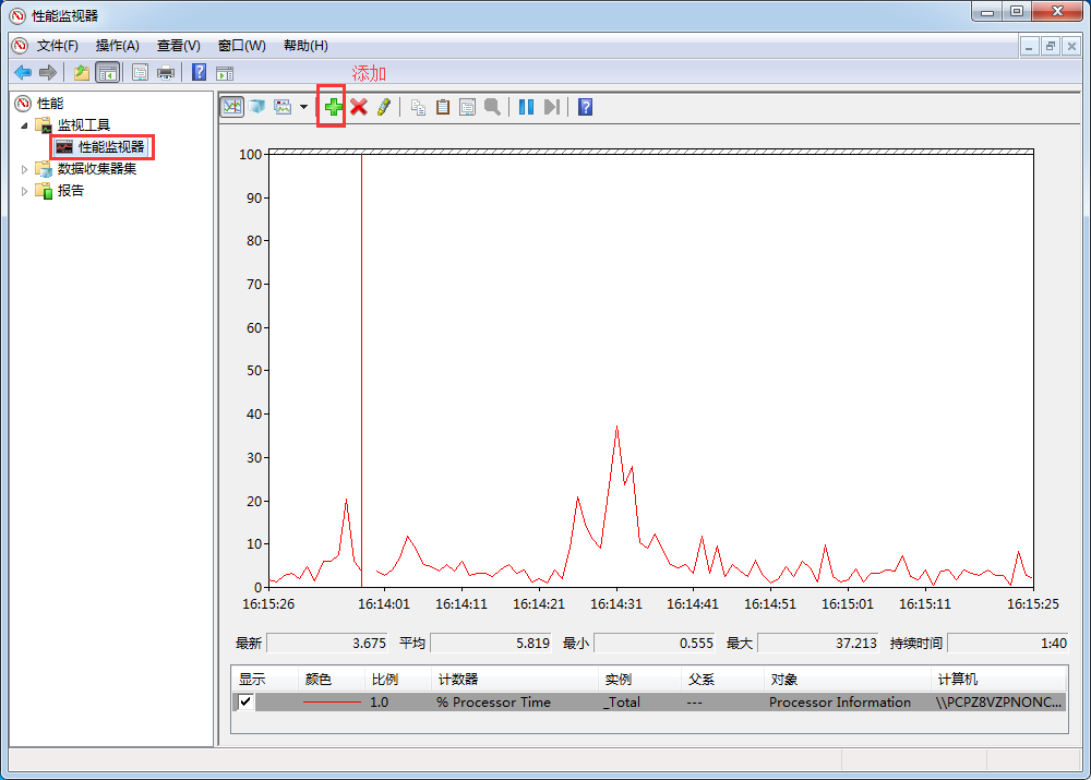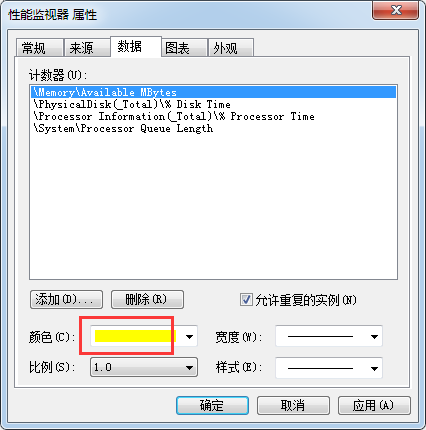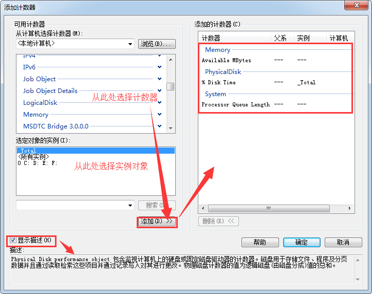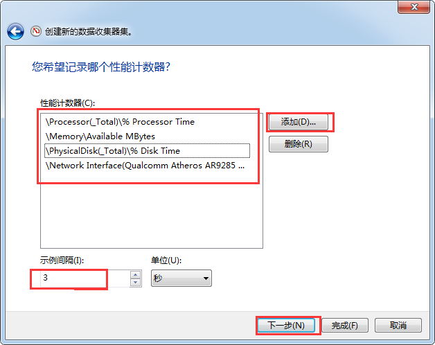 这里我们添加如下图所示3个计数器,加上之前监视器默认监视的1个计数器,总共是监视4个计数器。分别为:CPU、内存、磁盘IO和处理器队列长度。