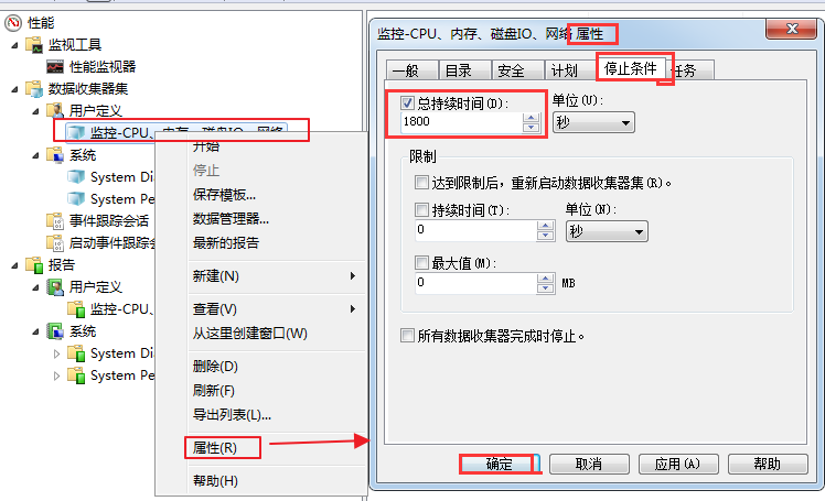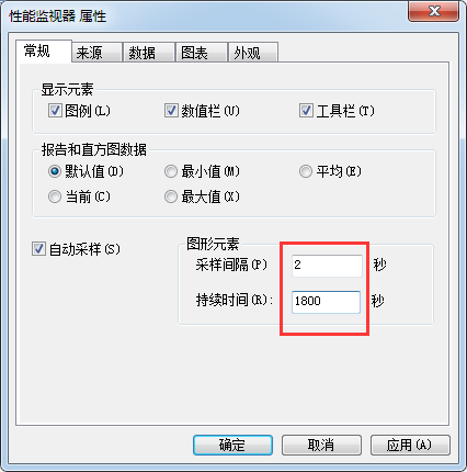 监视器默认的采样间隔为1秒,持续时间为100秒,我们可以根据实际情况对其进行修改