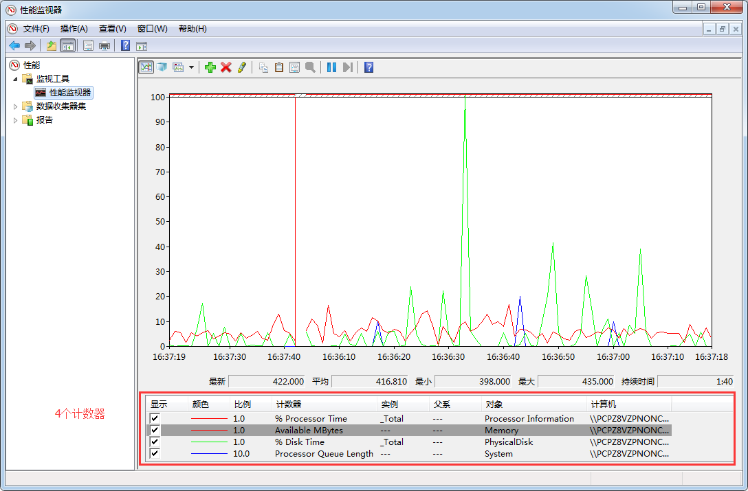 4.点击“确定”按钮显示下图,监视器会自动显示每个计数器在持续时间内的最大值最小值和平均值