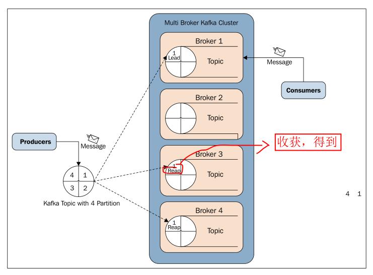 在副本策略中,消息的每个分区都有n个副本,并且可以承受n-1个节点故障,保证消息分发。