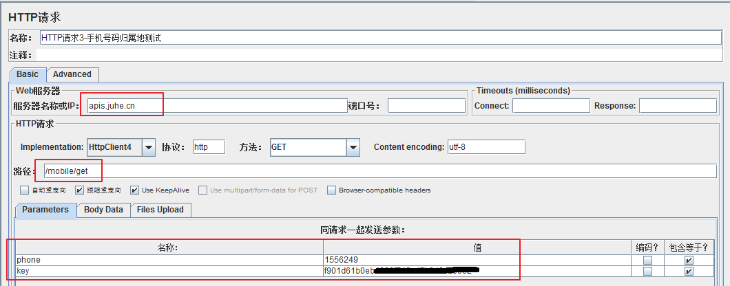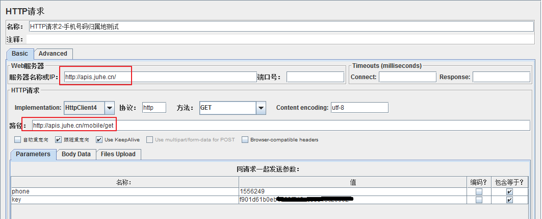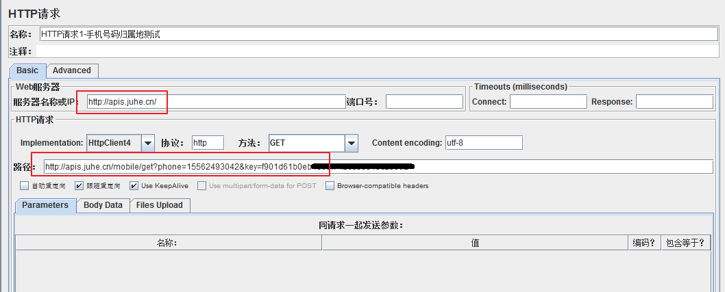 jmeter测试手机号码归属地接口时,HTTP请求有以下两种书写方法: