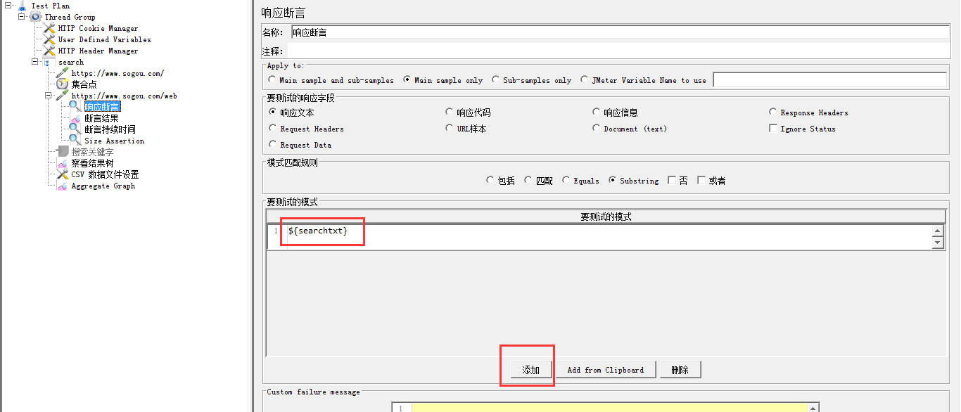 右击请求–>添加–>断言–>响应断言–>添加“要测试的模式”为${searchtxt}。