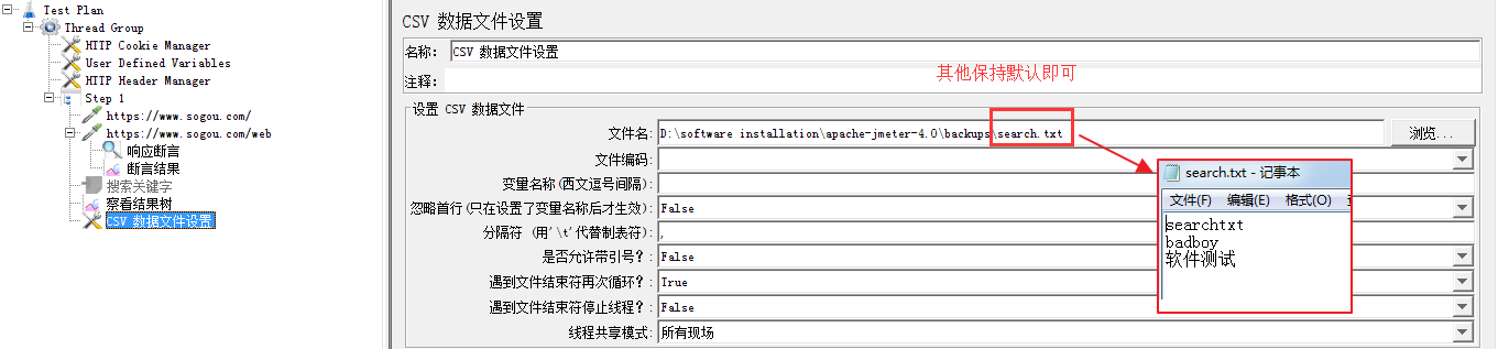 2.右击“Step 1”–>添加–>配置元件–>CSV 数据文件设置–>如下图。