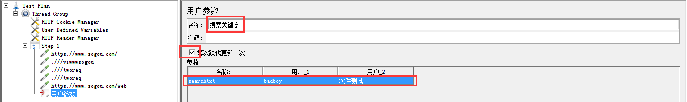 6.建立参数化列表。右击“Step 1”–>添加–>前置处理器–>用户参数–>修改名称、添加变量或者用户、勾选“每次迭代更新一次”。
