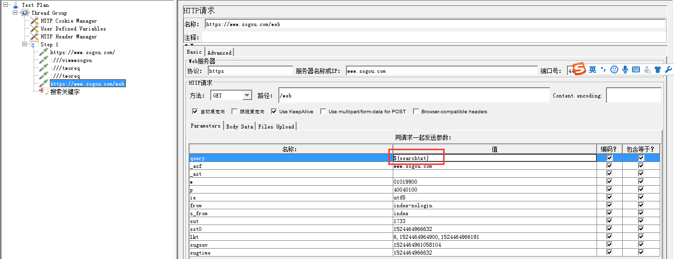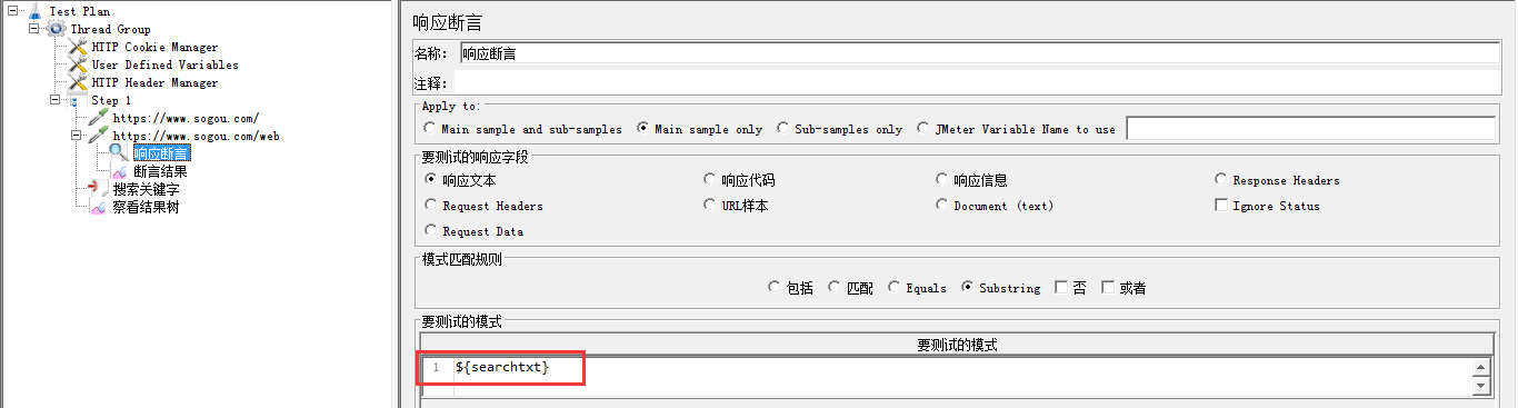 9.右击“http://www.sogou.com/web”–>添加–>断言–>响应断言–>添加“要测试的模式”为${searchtxt}。