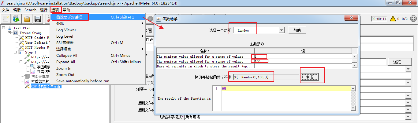 1.选项–>函数助手对话框(jmeter里面常用的函数都在这里面)–>选择“_Random”,设置最小值、最大值,生成,然后拷贝,在实际的请求中粘贴即可。