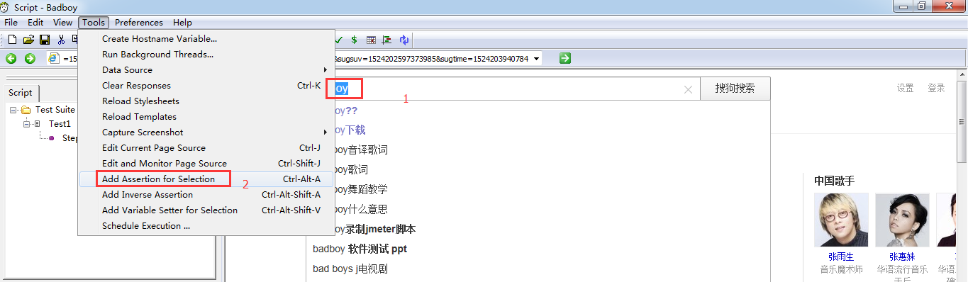 3.选中搜索框中的“badboy”,点击“Tools”–>”Add Assertion for selection”,下面显示Check for text “badboy”。