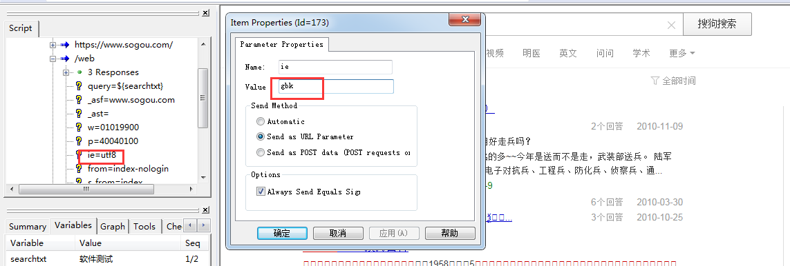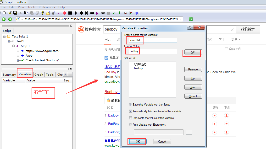 切换“Variables”标签–>右击空白–>Add Variable…–>输入名字“searchtxt”,当前值为“软件测试”和“badboy”,其他保持默认–>OK