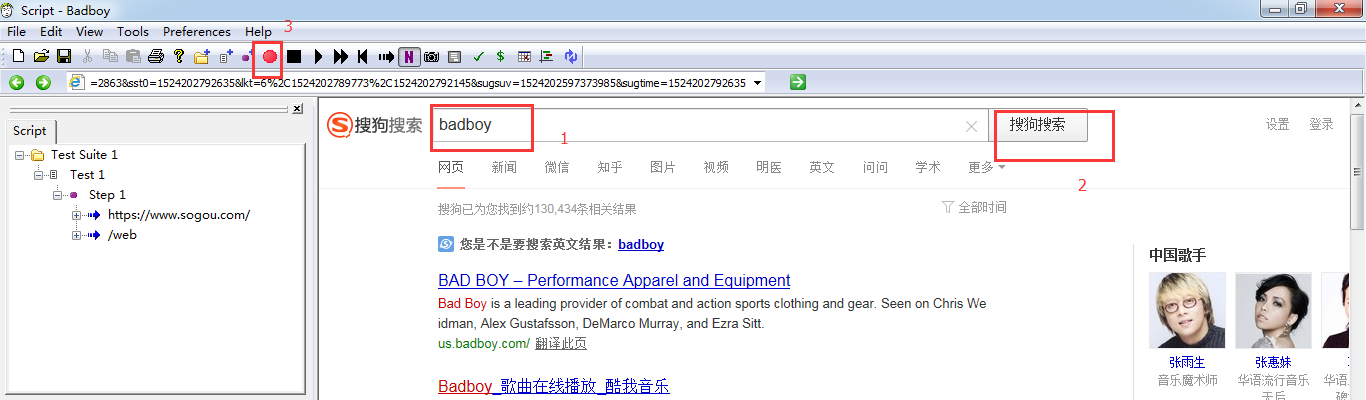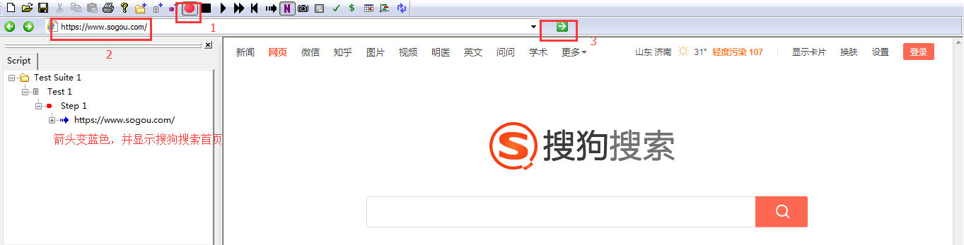 1.打开badboy工具,点击红色按钮开始录制,在地址栏目中输入地址:www.sogou.com,回车。