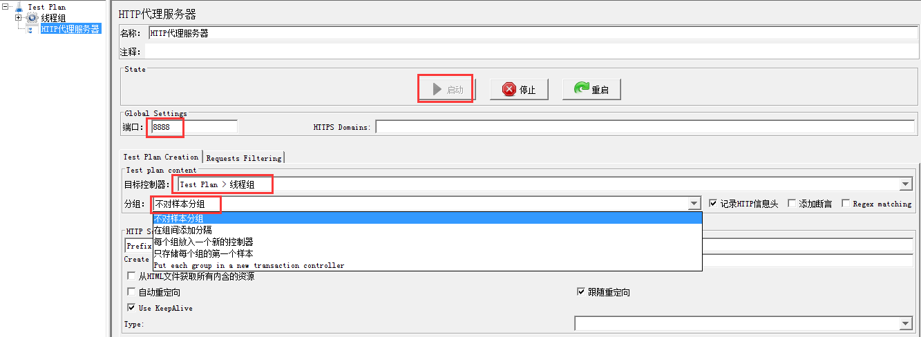 4.目标控制器:录制的脚本存放的位置,可选项为测试计划中的线程组(根据实际来选择即可)。