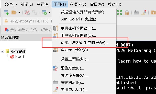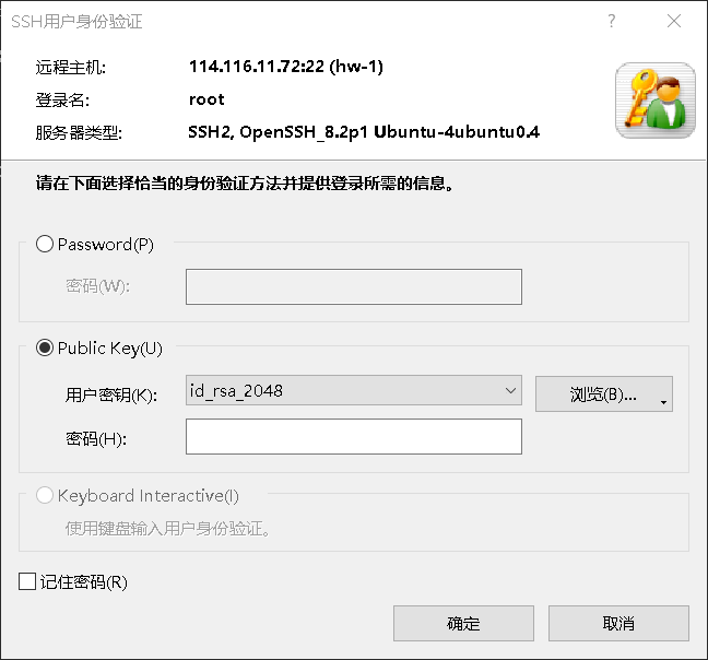 现在通过xshell就可以点击公钥模式选项进行登录了 此处的密码是刚才给密钥加密的密码