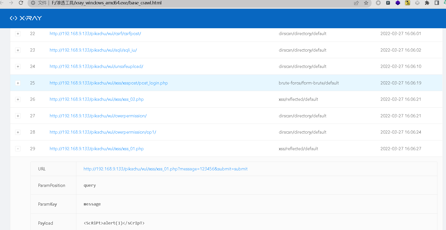 xray_windows_amd64.exe webscan --basic-crawler http://192.168.9.133/pikachu/ --html-output base_crawl.html