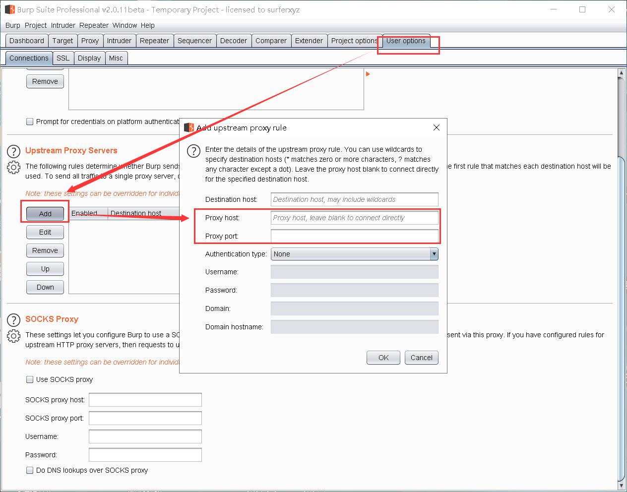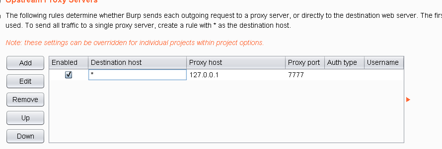 在user options配置代理设置 proxy host 、proxy port为代理服务器ip和端口,Destination host如果不填默认所有访问的网址都会走代理