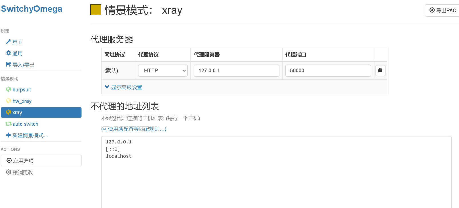 - 先在最左侧配置代理设置,地址和端口为xray用于监听的地址与端口
