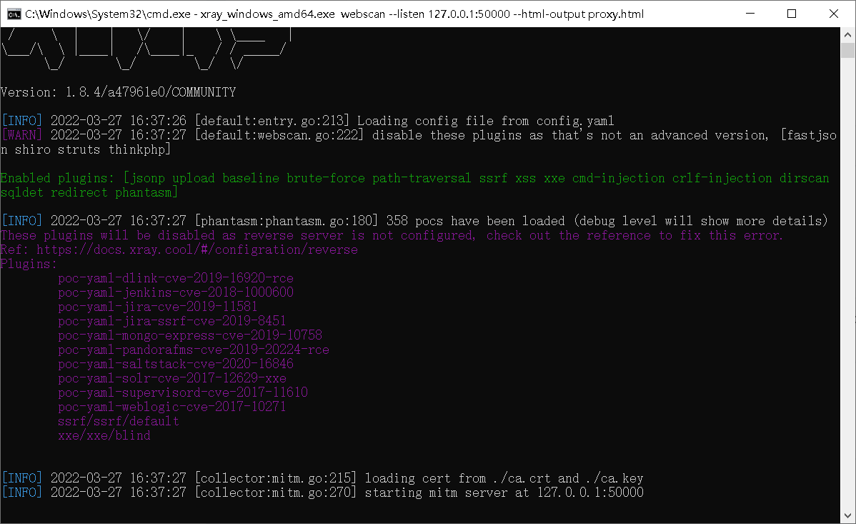 xray_windows_amd64.exe webscan --listen 127.0.0.1:50000 --html-output proxy.html