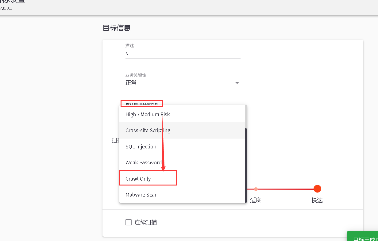 - 将扫描模式变成仅爬取,下面的配置文件自定义修改,创建好后点击扫描即可