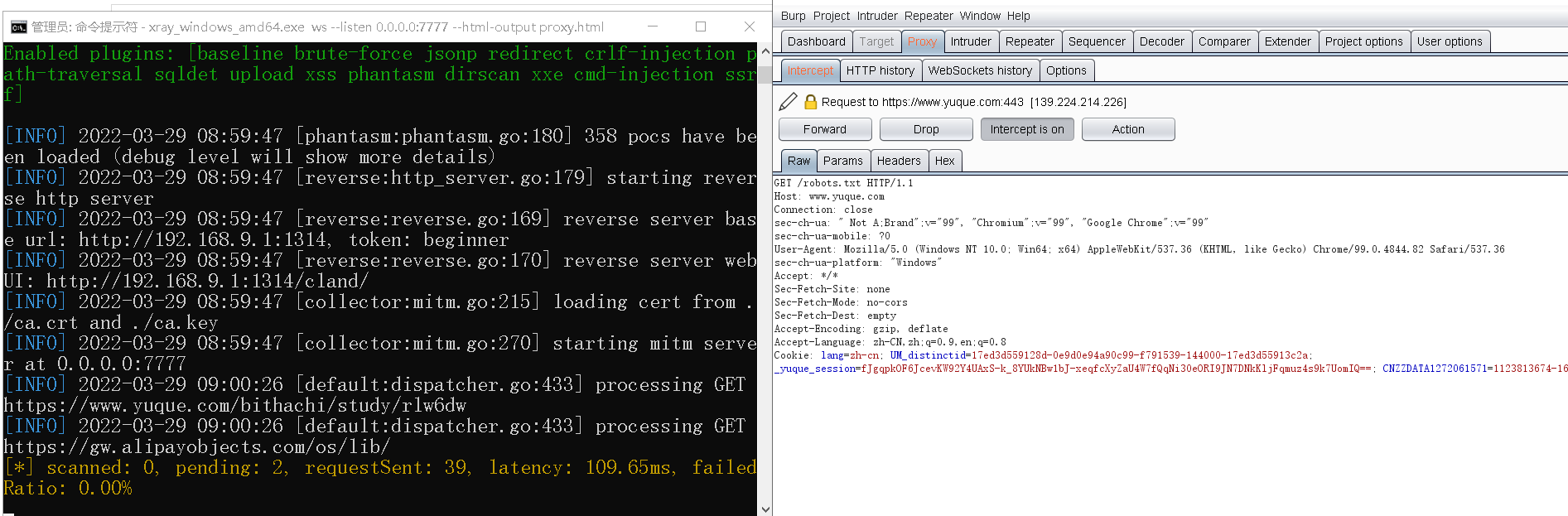 浏览器—>burp(手动分析)—-xray(自动扫描)—->目标网址—>xray—->burpsuit—>浏览器
