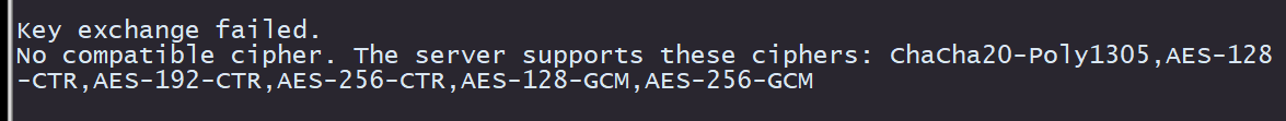 No compatible cipher. The server supports these ciphers: ChaCha20-Poly1305,AES-128-CTR,AES-192-CTR,AES-256-CTR,AES-128-GCM,AES-256-GCM
