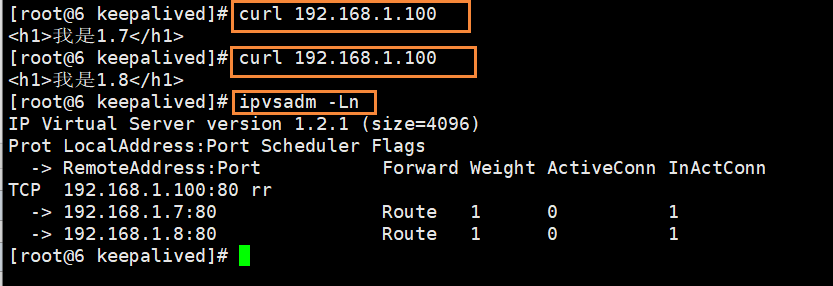 Prot LocalAddress:Port Scheduler Flags -> RemoteAddress:Port Forward Weight ActiveConn InActConn TCP 192.168.1.100:80 rr -> 192.168.1.7:80 Route 1 0 0 -> 192.168.1.8:80 Route 1 0 0