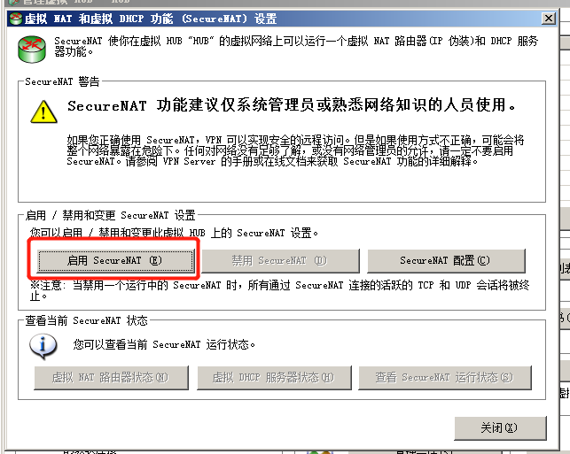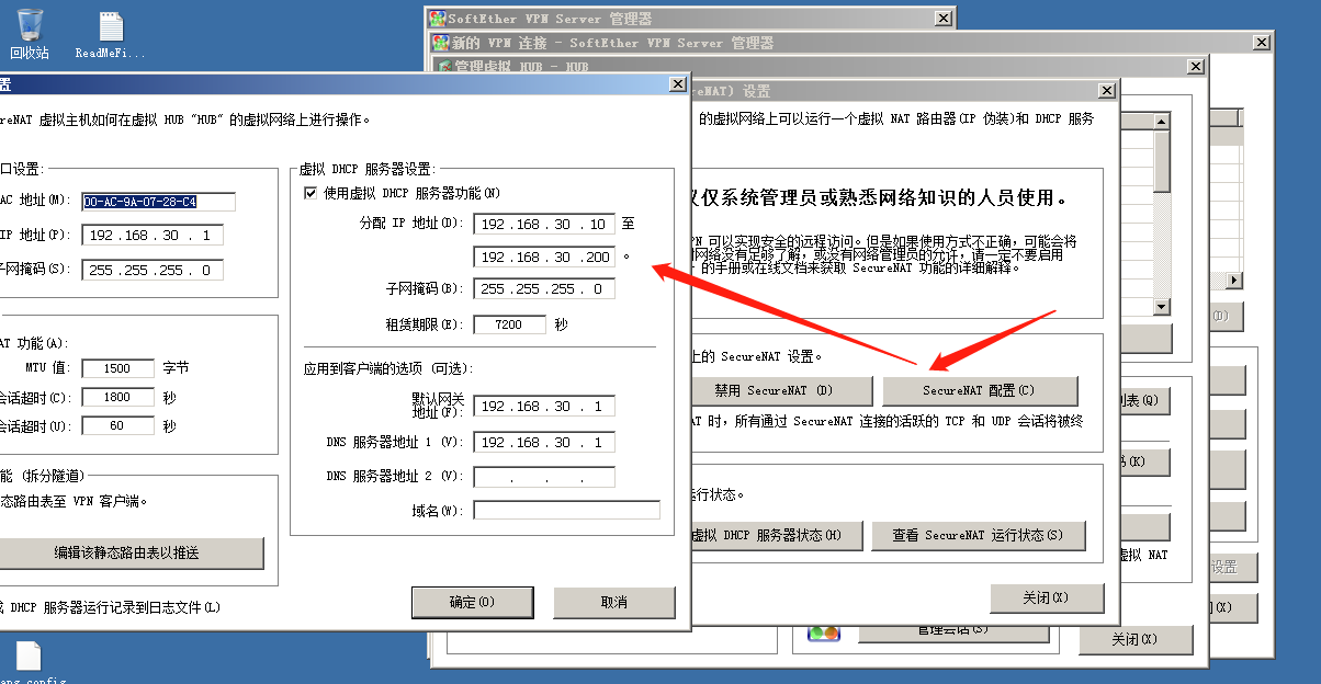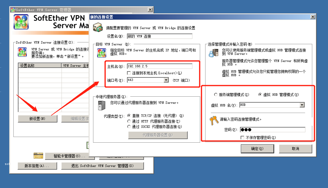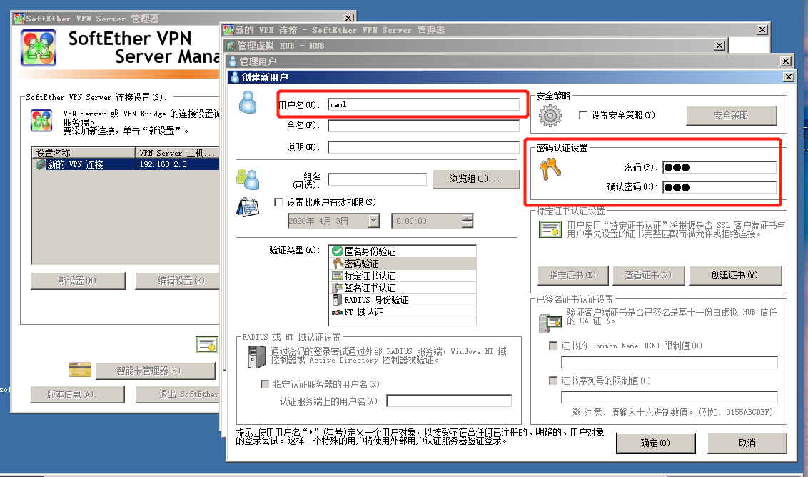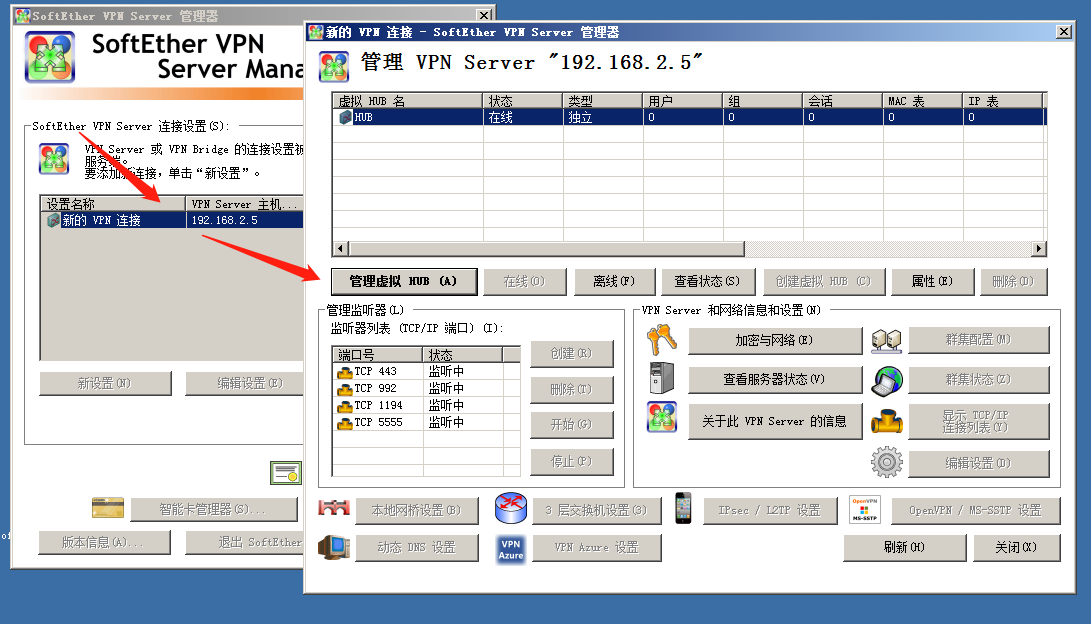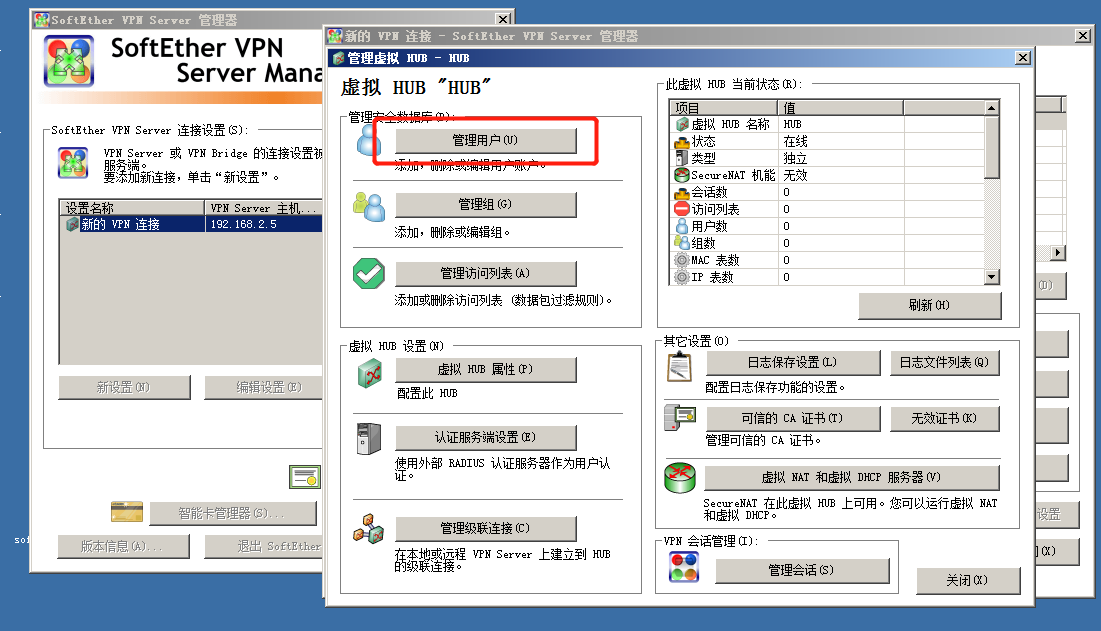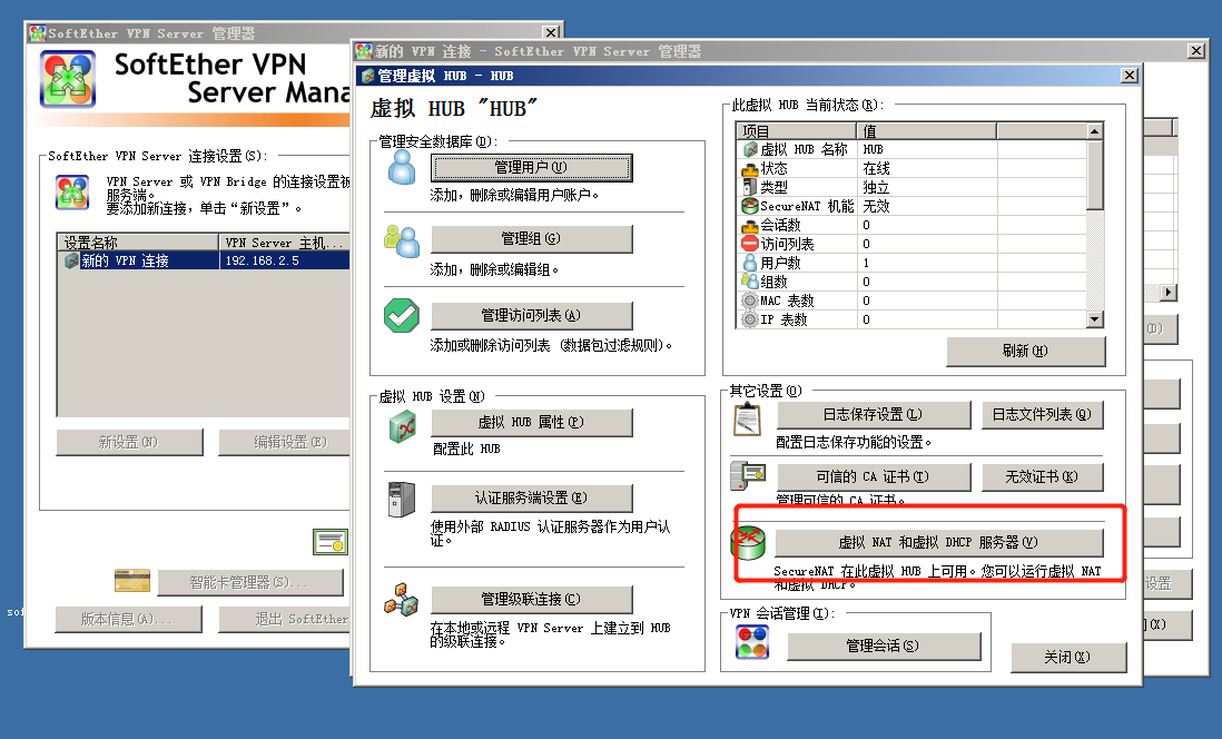 vpncmd 命令 - SoftEther VPN 命令行管理工具 SoftEther VPN 命令行管理工具 (vpncmd 命令) Version 4.20 Build 9608 (Simplified_Chinese) Compiled 2016/04/17 21:59:35 by yagi at pc30 Copyright (c) SoftEther VPN Project. All Rights Reserved. 通过使用 vpncmd 程序,可以取得以下成果。 1. VPN Server 或 VPN Bridge 的管理。 2. VPN Client 的管理。 3. 使用 VPN 工具 (证书创建和网络传输速度测试工具) 选择 1, 2 或 3: 1 #选择1 指定的主机名或目标 VPN Server 或 VPN Bridge 正在 运行的计算机 IP 地址。 通过以 "主机名:端口号" 格式指定,您还可以指定端口号。 (当没有指定端口号时,使用 443。) 如果不输入任何内容并按下回车键,将连接到端口号为 443 的本地主机 (这台电脑)。 目标 IP 地址的主机名: 如果通过虚拟 HUB 管理模式连接到服务器,请输入虚拟 HUB 的名称。 如果通过服务器管理模式连接,无须输入任何内容请按回车键。 指定虚拟 HUB 名称: 与服务器 "localhost" 的连接已建立 (端口 443)。 您有整个 VPN Server 的管理员权限。 VPN Server>ServerPasswordSet #设定一个密码 ServerPasswordSet 命令 - 设置 VPN Server 管理员密码 请输入密码。要取消,请按下 Ctrl + D 键。 密码 : *** #123 确认输入: *** #123 命令成功完成。 VPN Server>HubCreate HUB #创建一个HUB HubCreate 命令 - 创建新的虚拟 HUB 请输入密码。要取消,请按下 Ctrl + D 键。 密码 : *** 确认输入: *** 命令成功完成。 VPN Server>