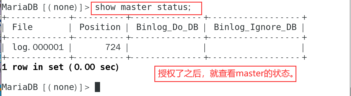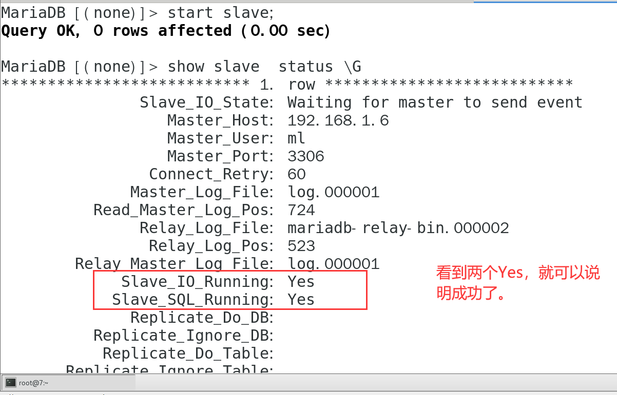 MariaDB [(none)]> change master to master_host=’192.168.1.6′, master_user=’ml’, master_password=’123′, master_log_file=’log.000001′, master_log_pos=724; #这两个需要去show master status去看(注意:会变的。)