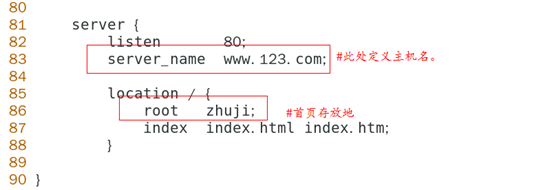 配置文件中server{ }结束符在79行。所有我们在 80行这样写下配置。
