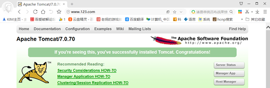 实现效果:打开浏览器,输入地址www.123.com,会自动跳转到本地linux的Tomcat服务器中。