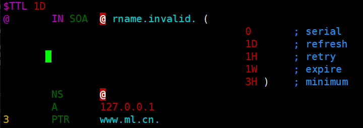[root@localhost named]# vim ml.cn.zone