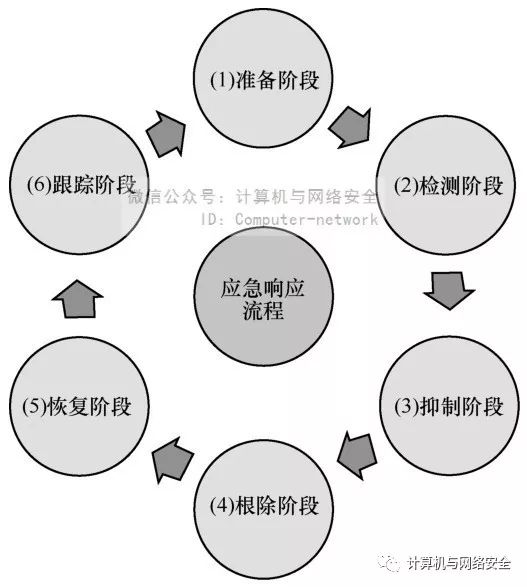 为最大限度科学、合理、有序地处置网络安全事件,采纳了业界经典的PDCERF方法学,将应急响应分成准备、检测、抑制、根除、恢复、总结6个阶段的工作。