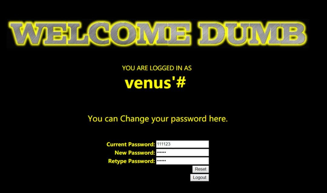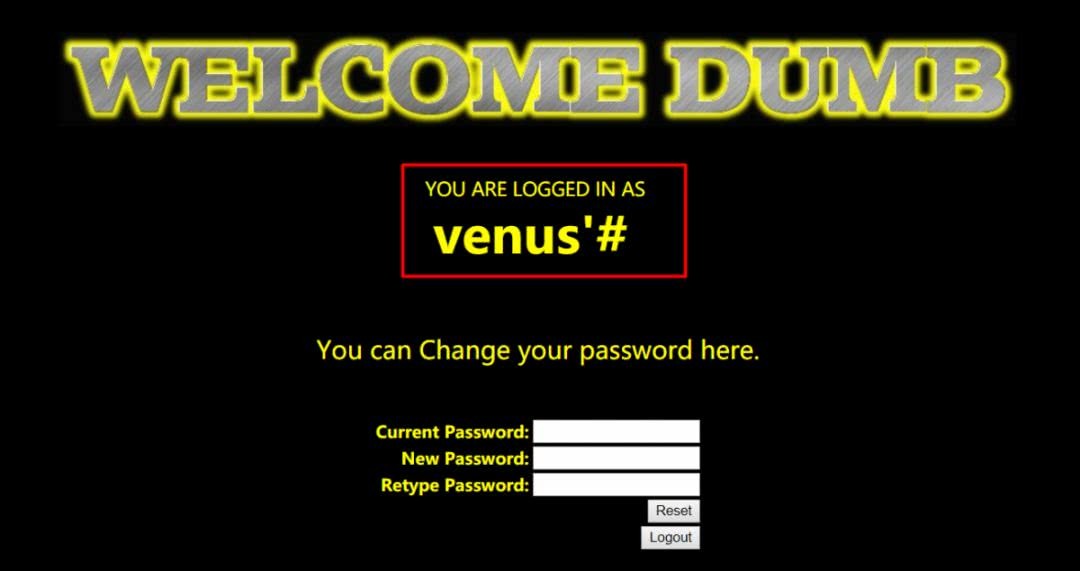UPDATE users SET PASSWORD=’123456′ where username=’venus’#’ and password=’$curr_pass’
