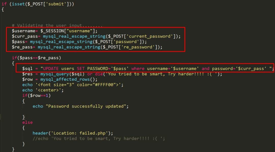 可以看到$username是直接从session中获取的,并没有进行转义操作,而其他的几个变量如$curr_pass和$pass都已经经过mysql_real_escape_string函数处理。问题就出在$username这个参数上,session中的username是从数据库中获取到的。