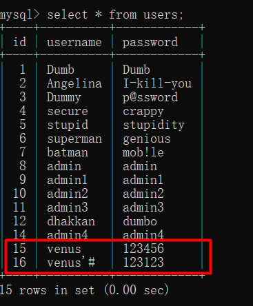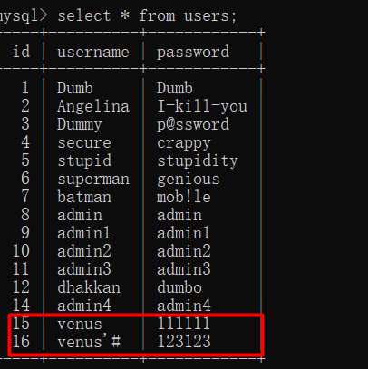 由于#号注释掉了后面的语句,所以,我们本来是修改的venus’#的密码,但实际上修改了venus的密码,而且venus’#的当前密码也可以随便输入。